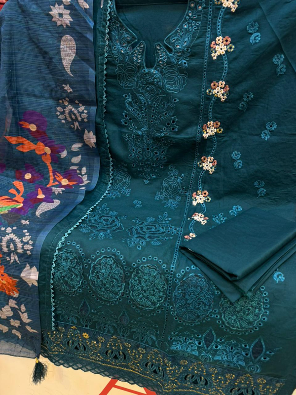 বডিতে ব্যবহৃত হয়েছে প্রিমিয়াম জ্যাকুয়ার্ড ফেব্রিক, যা আরামদায়ক ও লাইট ওয়েট। সাথে কটন সালোয়ার ও পাকিস্তানি কোটা ফেব্রিকের প্রিন্টেড ও এম্ব্রয়ডারি দুপাট্টা—সব মিলিয়ে একদম পারফেক্ট সেমি স্টিচড সেট।
