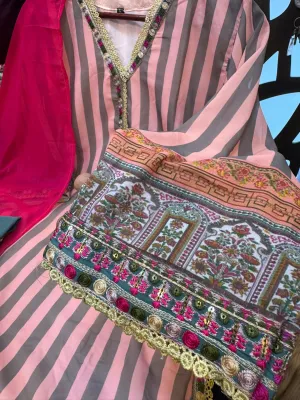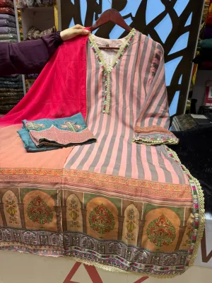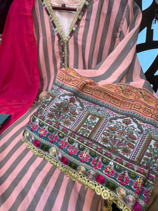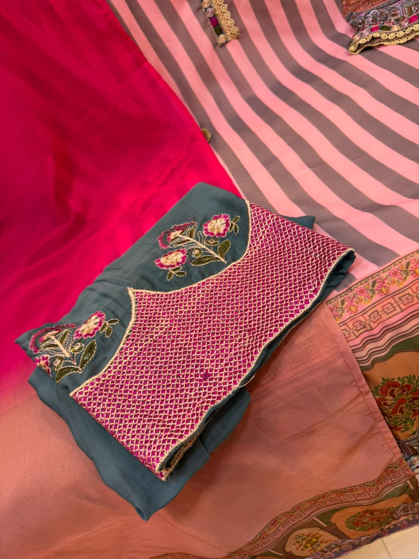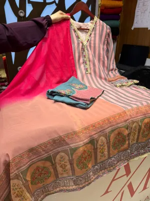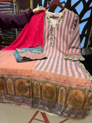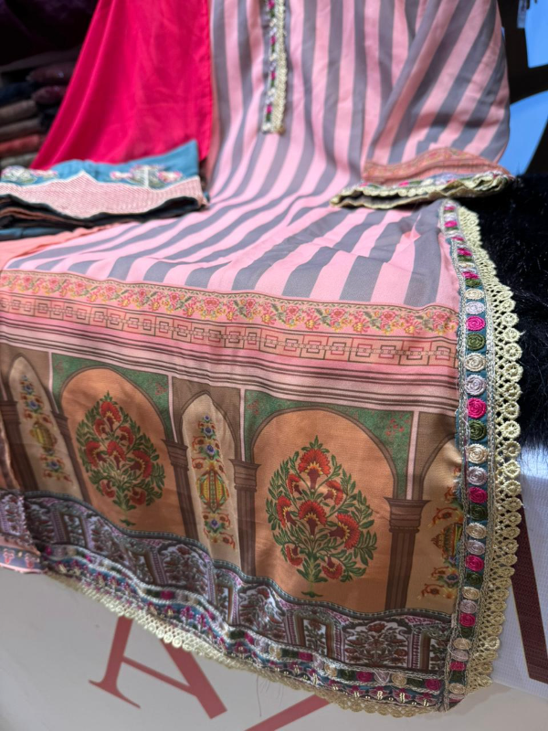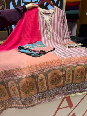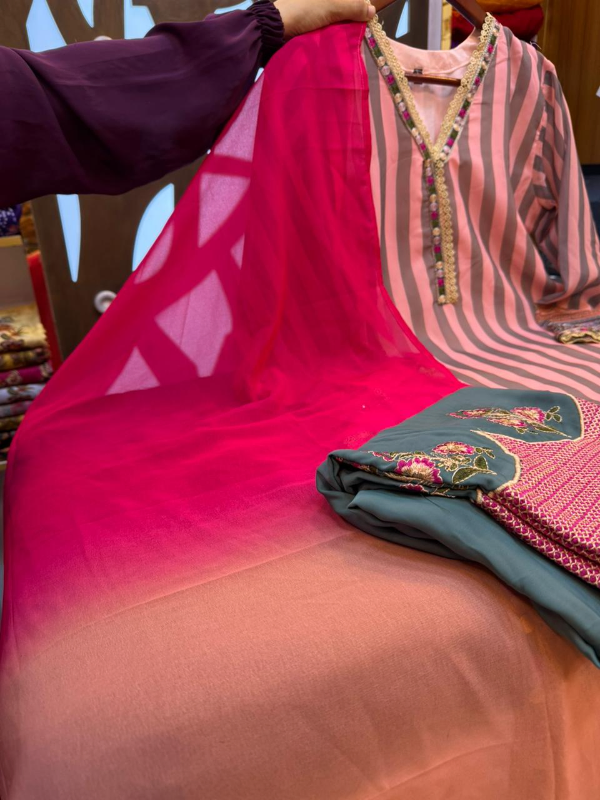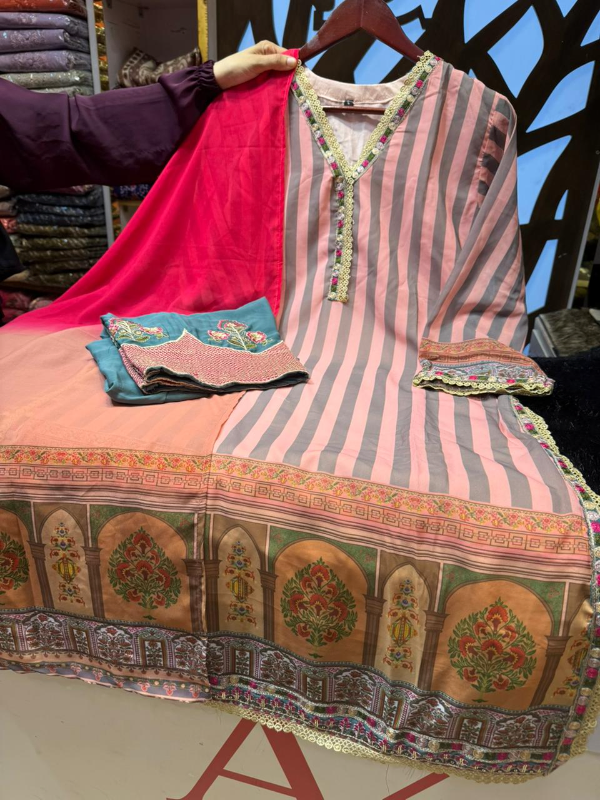 স্টাইলিশ ও এক্সক্লুসিভ এই কালেকশন তৈরি করা হয়েছে জর্জেট প্রিন্টেড ফ্যাব্রিক দিয়ে। কামিজে রয়েছে ডিজিটাল প্রিন্ট এবং গলার অংশ ও হাতায় এম্ব্রয়ডারি প্যানেল অ্যাটাচড, যা পোশাকটিকে দিয়েছে এলিগ্যান্ট লুক। সালোয়ারে রয়েছে জর্জেট এমব্রয়ডারি ও সিকোয়েন্স ওয়ার্ক, আর সাথে রয়েছে জর্জেট প্রিন্টেড দুপাট্টা, যা পুরো সেটকে করে আরও আকর্ষণীয়। বাড়তি আরামের জন্য ফ্রন্ট ও ব্যাক সাইডে দেওয়া হয়েছে সিল্ক বাটার ইনার।