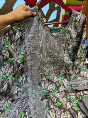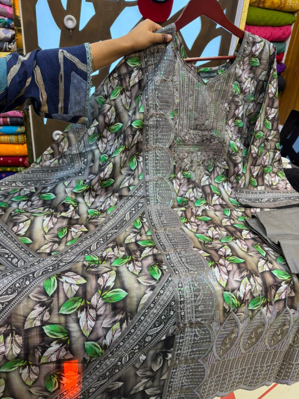 Elegant Pakistani-inspired Swiss Lawn suit with intricate boring work.