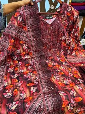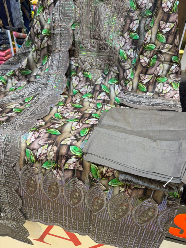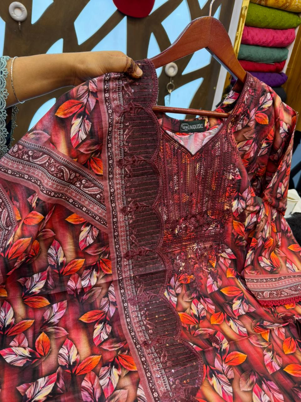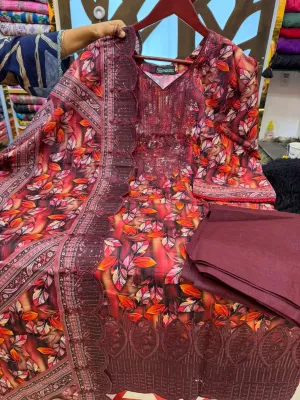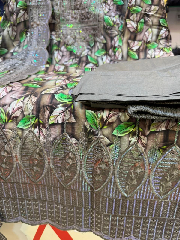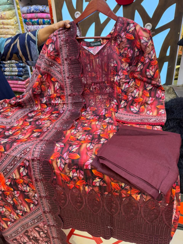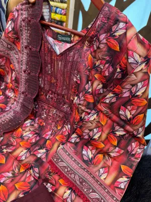 Fully stitched Swiss Lawn ensemble featuring premium embroidery and lace.