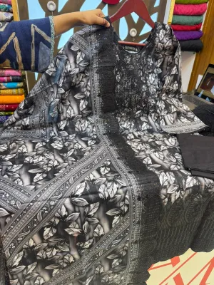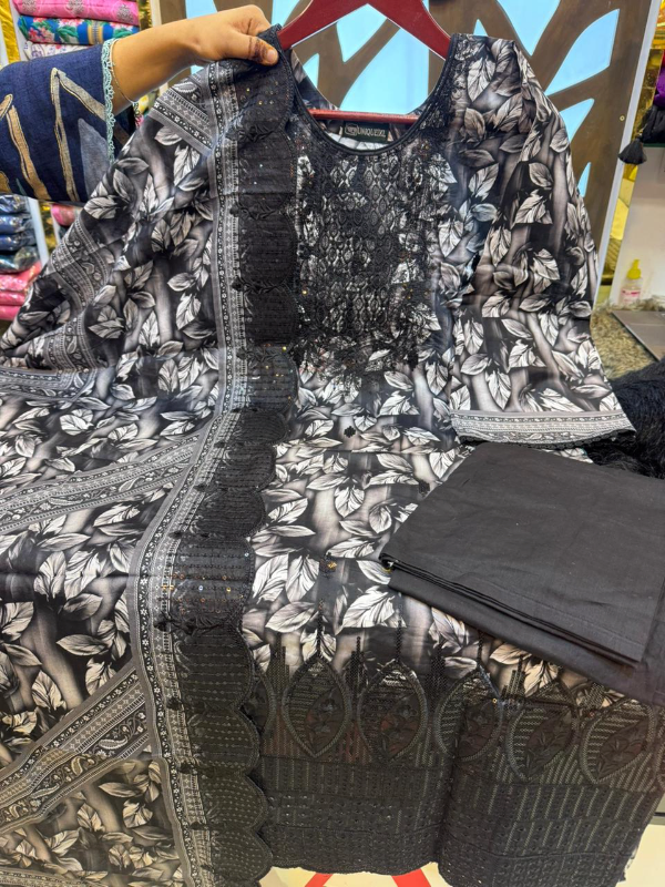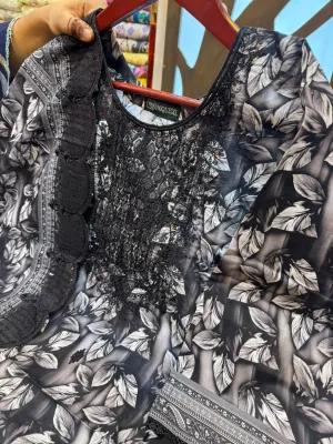 Fully stitched Swiss Lawn ensemble featuring premium embroidery and lace.